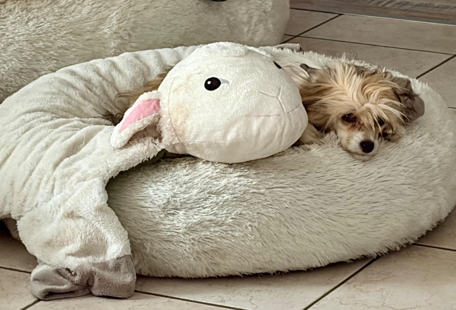 Nach diesem Begrüßungszeremoniell ist er absolut zufrieden, legt sich dann auch wieder in sein Körbchen..