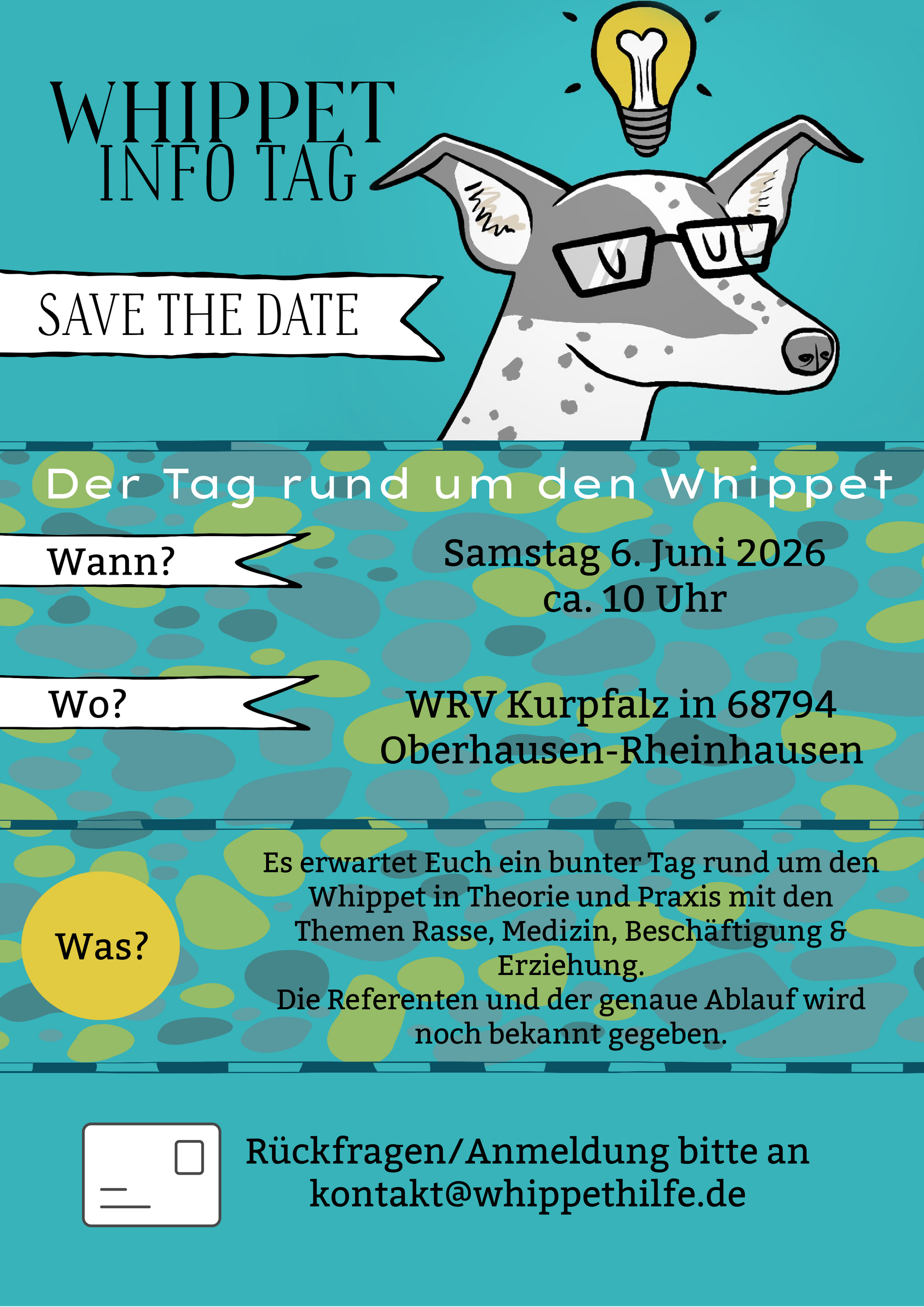 Demnächst werden die neuen Termine für 2026 veröffentlicht, wir planen wieder einen Whippet Info Tag und ein Whippet Hilfe Fest im Sommer/Herbst.