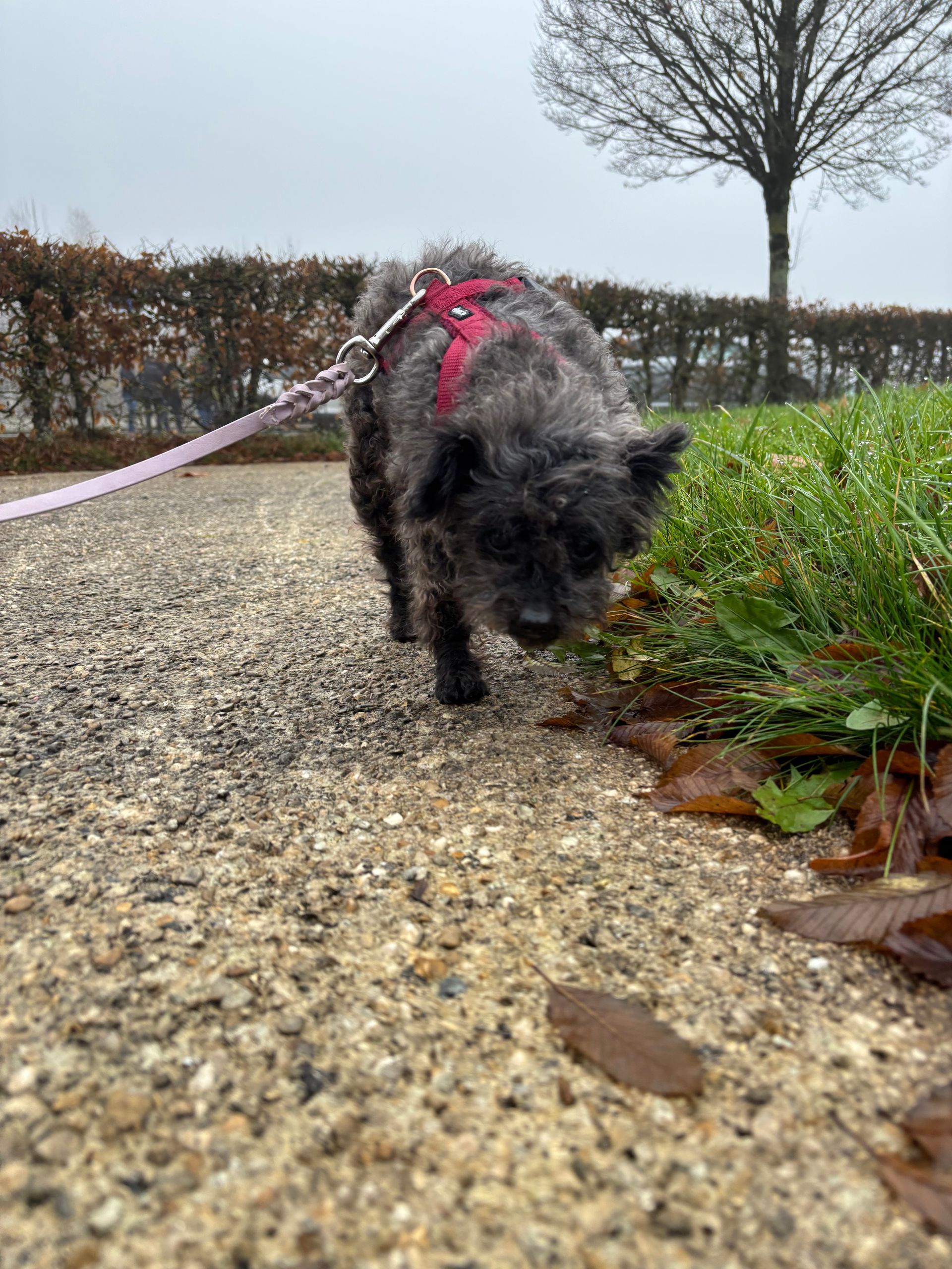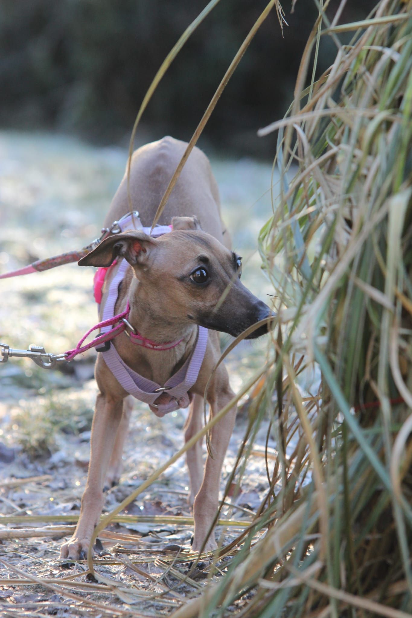 Draußen ist sie sehr interessiert, schnüffelt gerne und schaut auch mal Vögelchen hinterher.