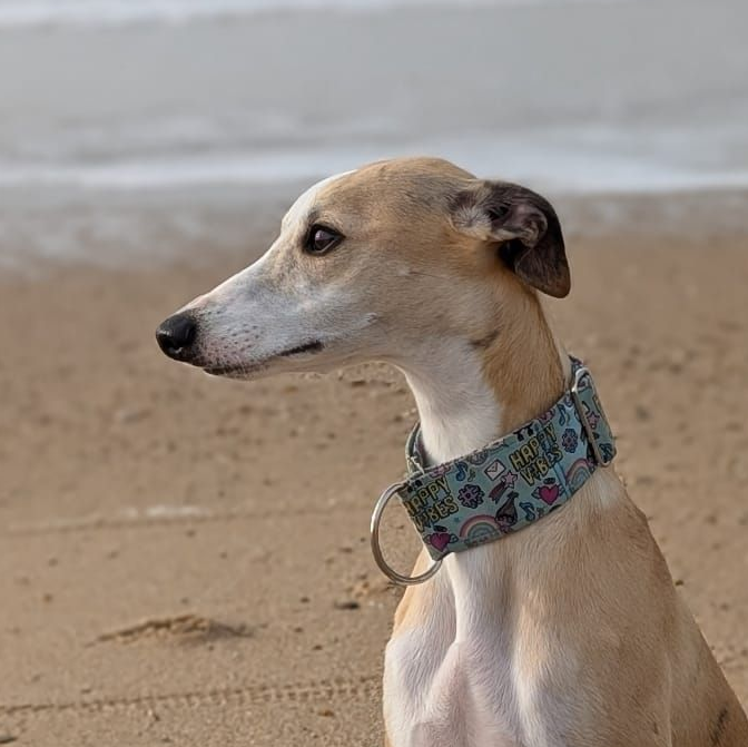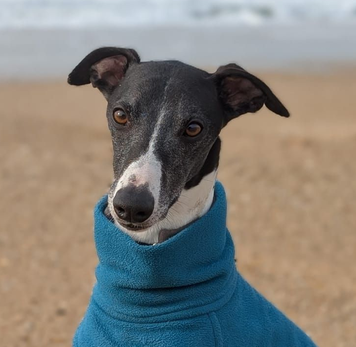 Die Glitzerknete-Junge-Hunde-Phase hat er hinter sich gelassen, er ist whippettypisch im Haus ein ruhiger Vertreter, der draußen gerne auf- und auch mal überdrehen kann.